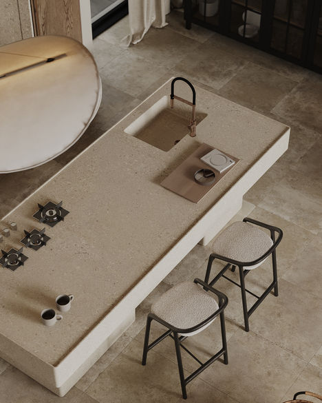 Abundant natural light from the large windows, combined with thoughtful artificial lighting, creates a warm and inviting atmosphere.