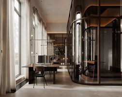 High ceilings, large windows, glass partitions, and dark colors give the office an elegant character.