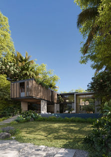 The villa is situated on a secluded property with a pool and palm trees, creating a tranquil resort-like atmosphere. Panoramic windows and sliding doors allow the interior spaces to merge with nature, blurring the boundaries between inside and outside.
